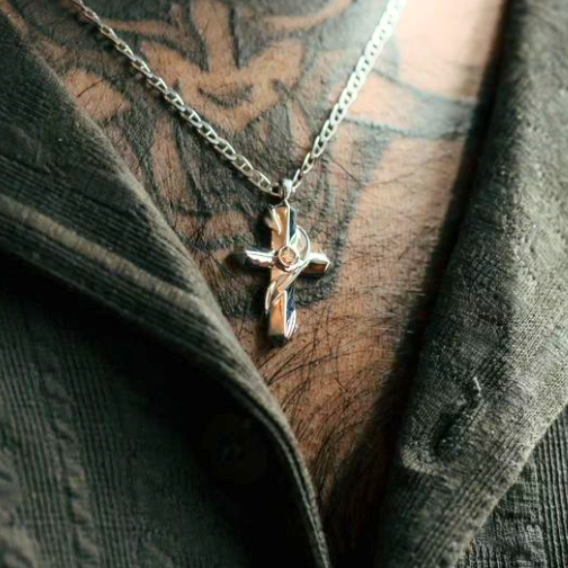 This men's cross necklace is elegantly wrapped in a ribbon design and diamond center. Can be made as an ashes necklace on request.